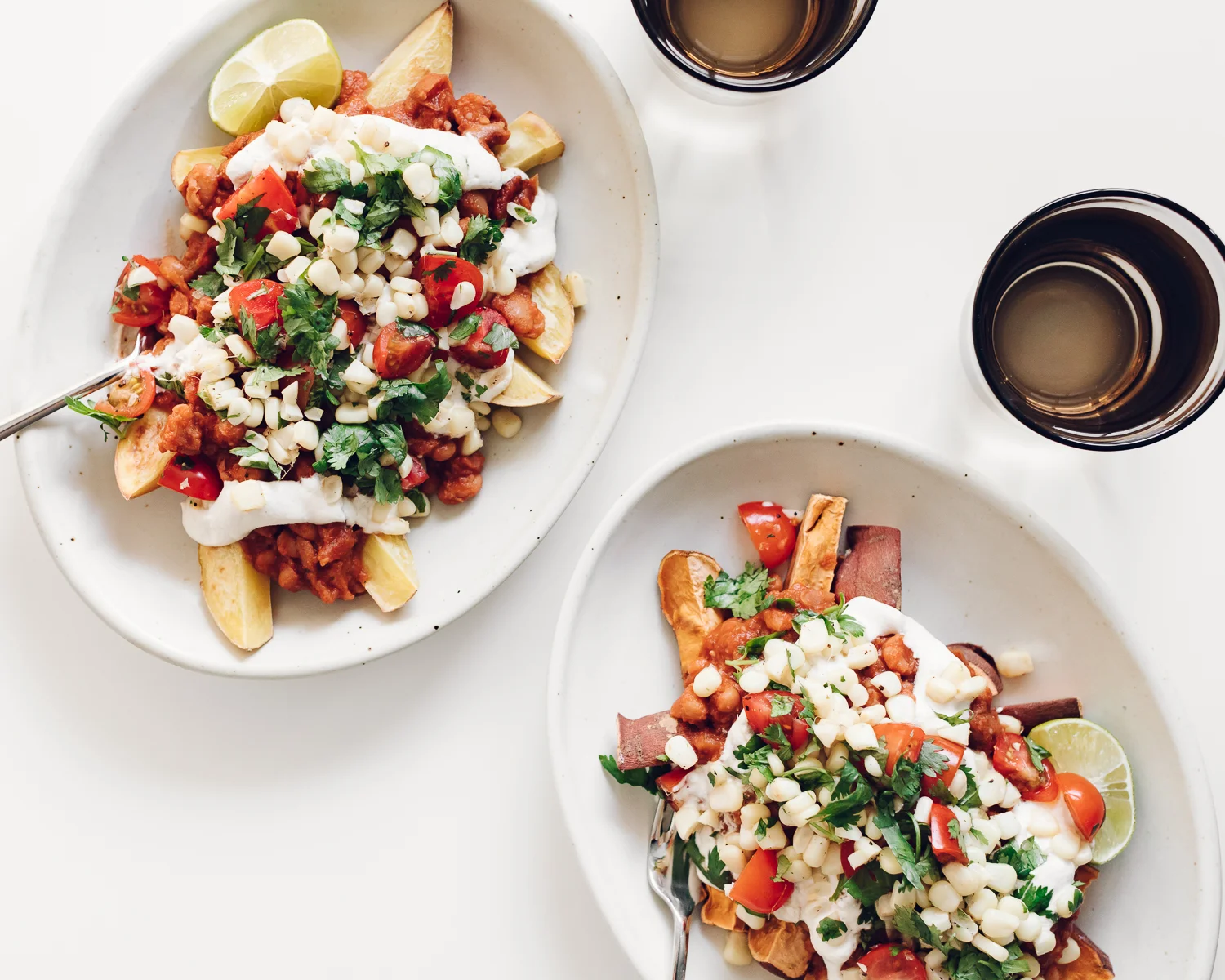 When the fries are done baking, divide them between two serving plates. Top each mound of fries with the chili, spoonfuls of cashew sour cream, and the cherry tomato corn salsa. Enjoy right away.